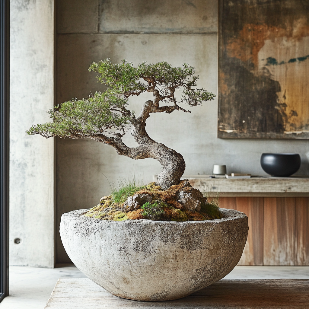 Pin bonsaï et lychens, vasque en roche sculptée.