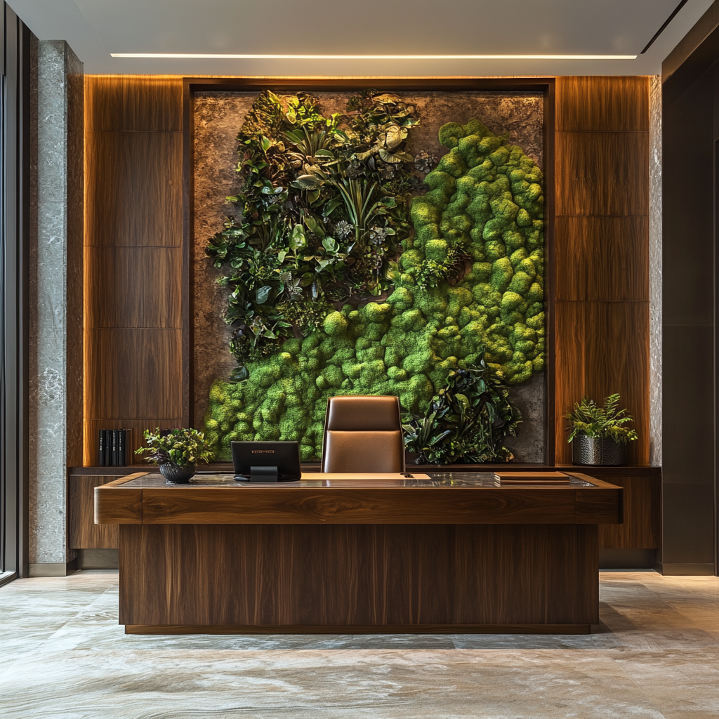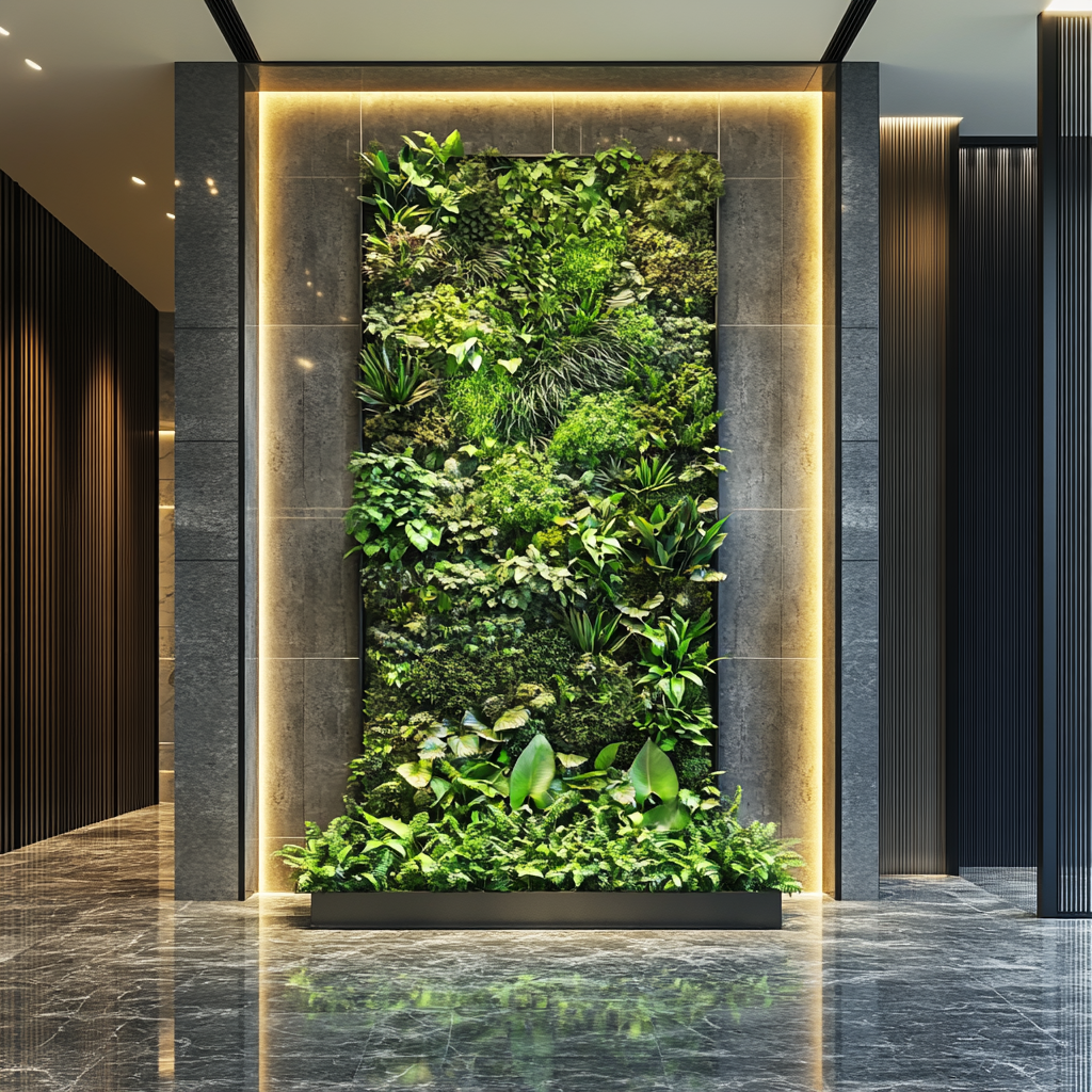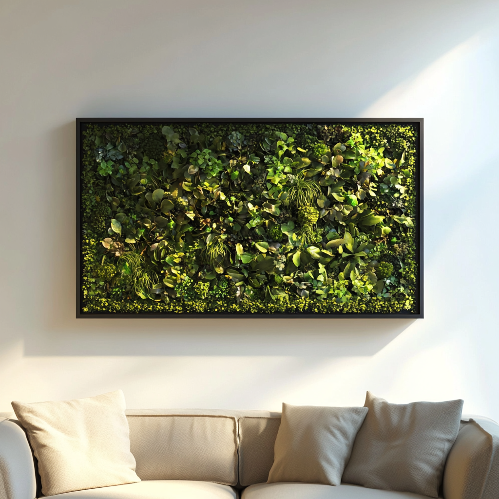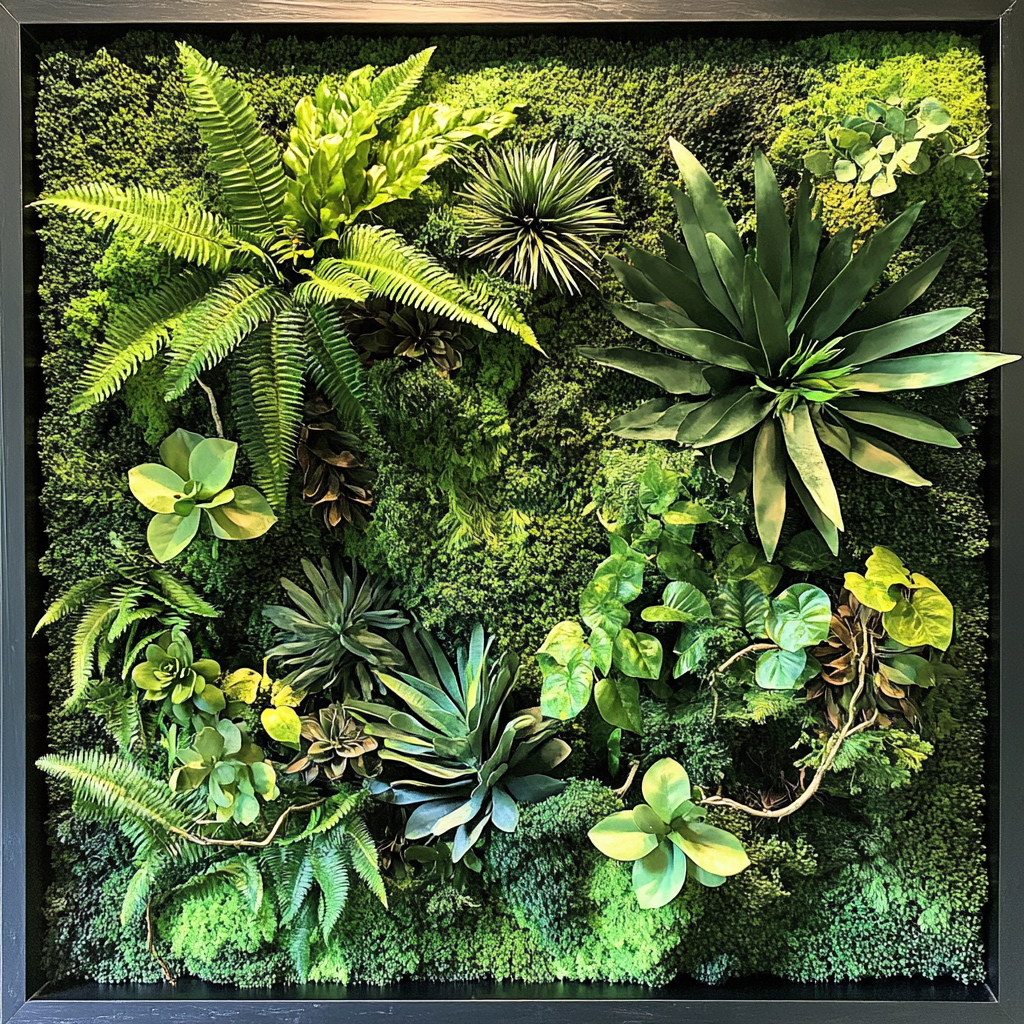 Installation paysagère murale de lychens et ensemble de plantes de type tropicale, cadre en bois.