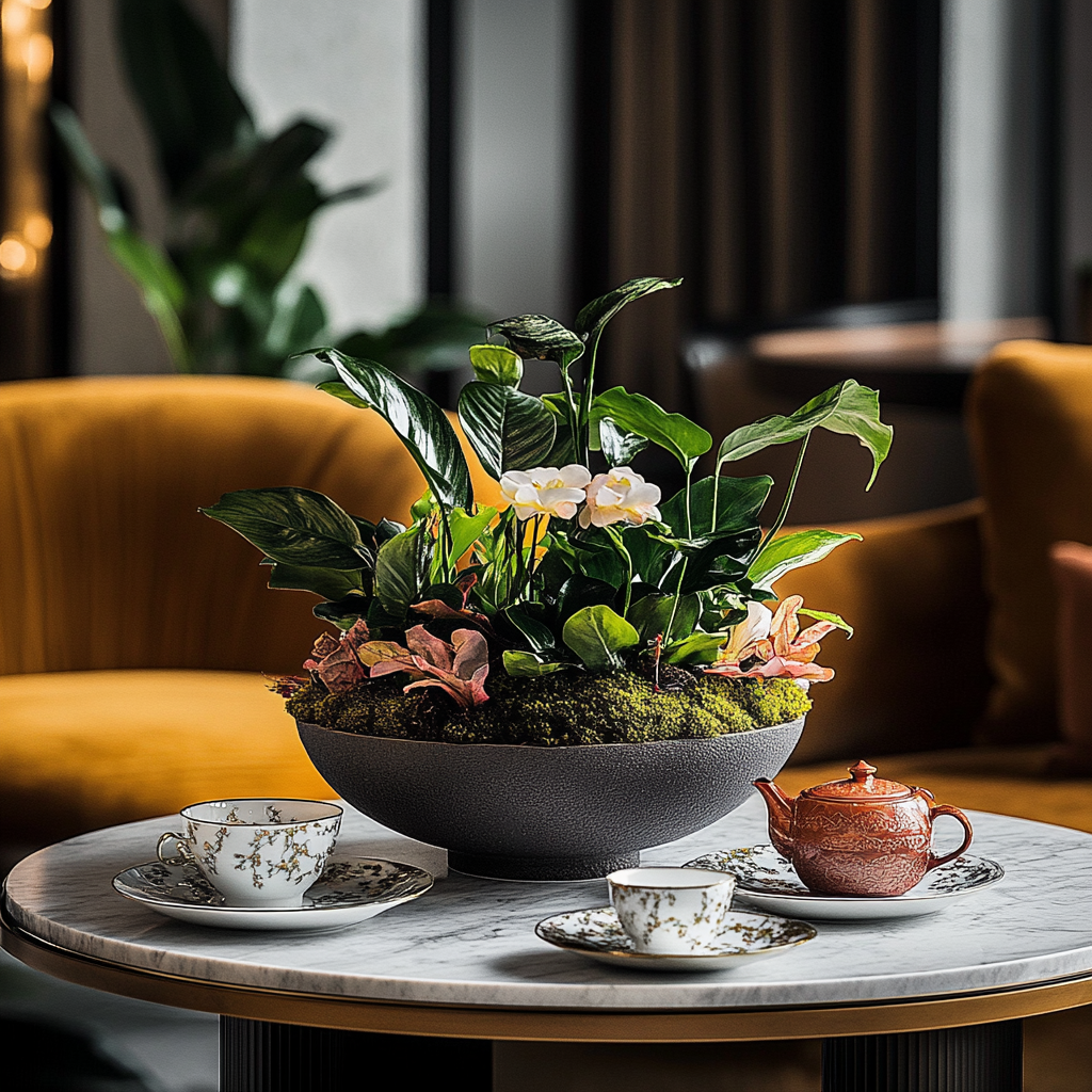 Ornement Araceae et mousses, vasque en céramique