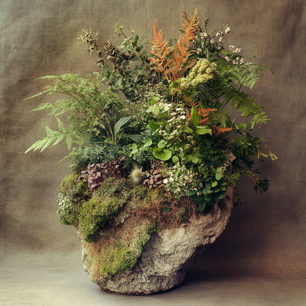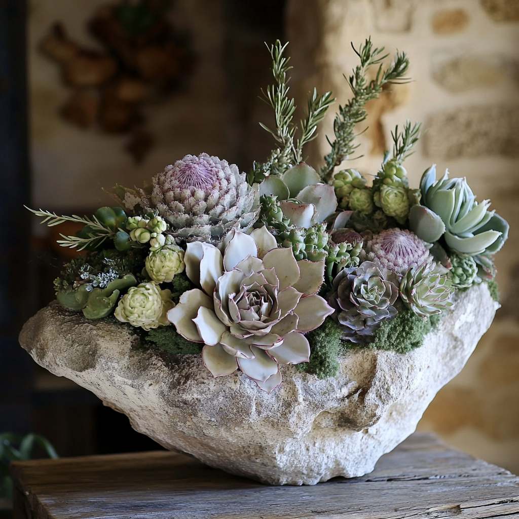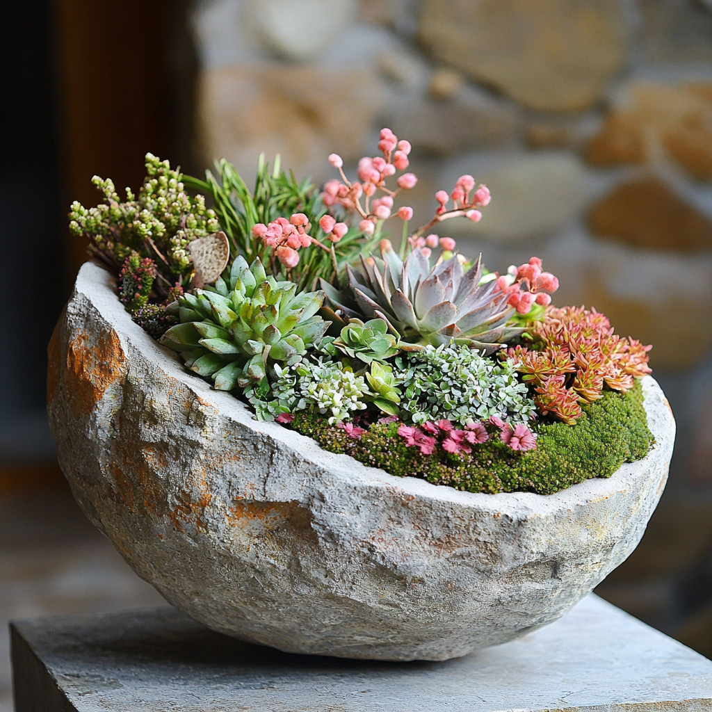 Ensemble de plantes grasses, support en pierre creusée.