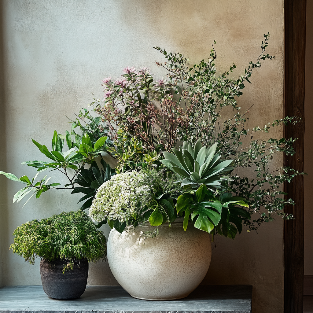 Composition végétale et florale, échantillons de grands sujets; pot en céramique.