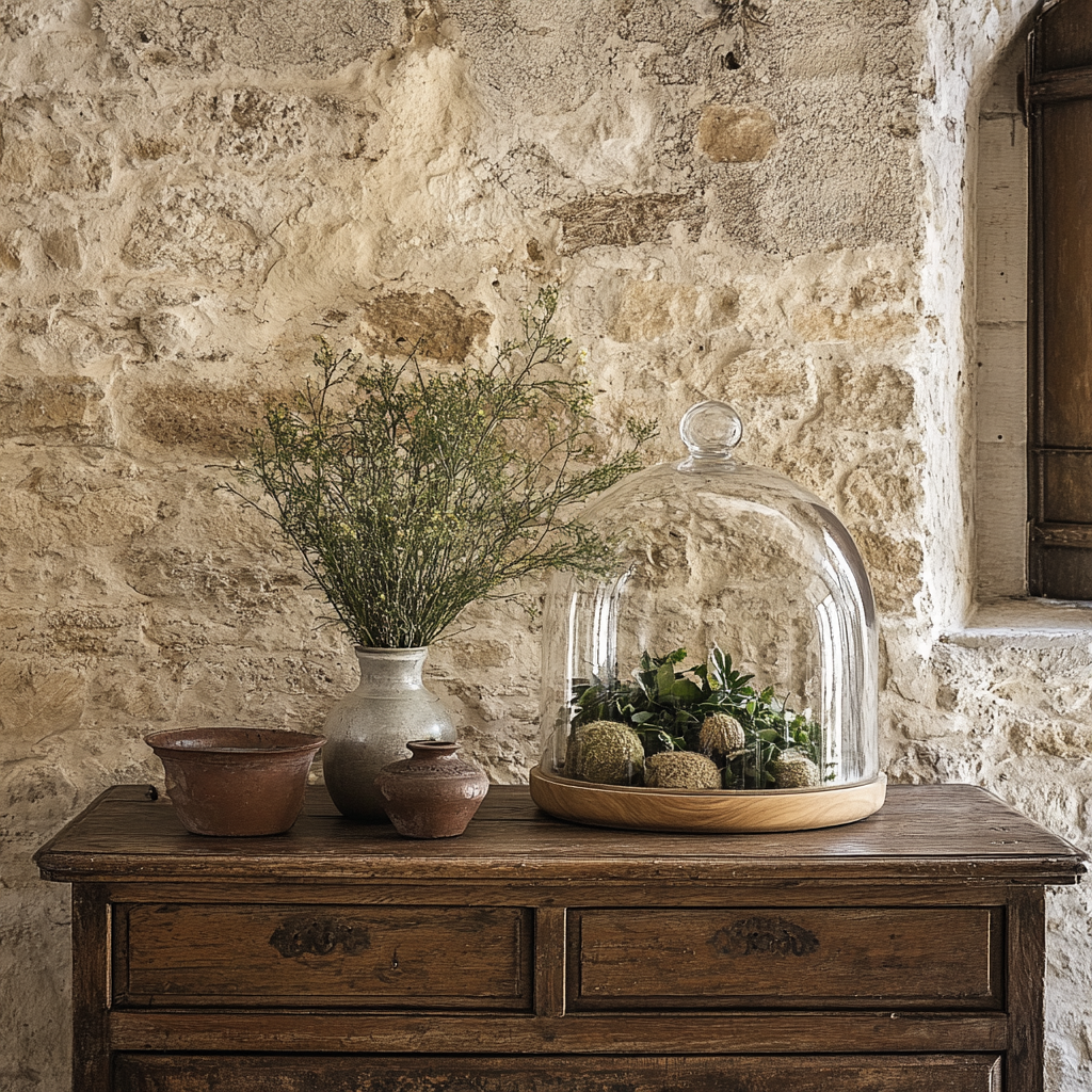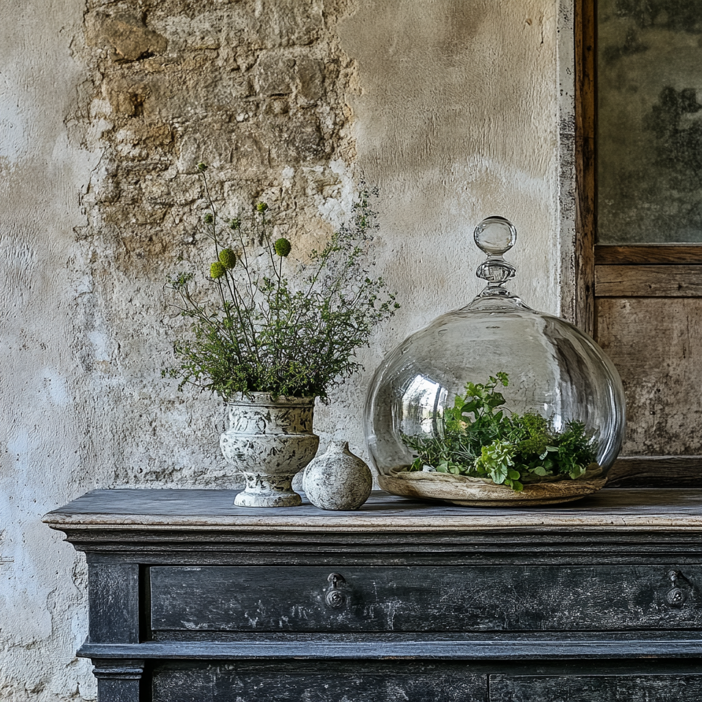 Ensemble de Cactaceae et Araceae sous cloche en verre.