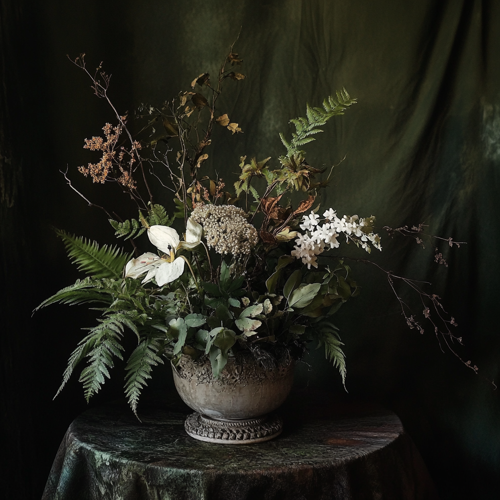 Arrangement floral et végétal, vase en métal.