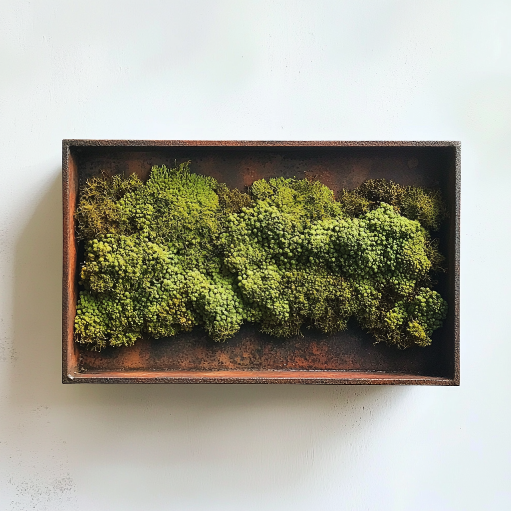 Trame paysagère mousse et Araceae, fond texturé dans une cadre en bois.