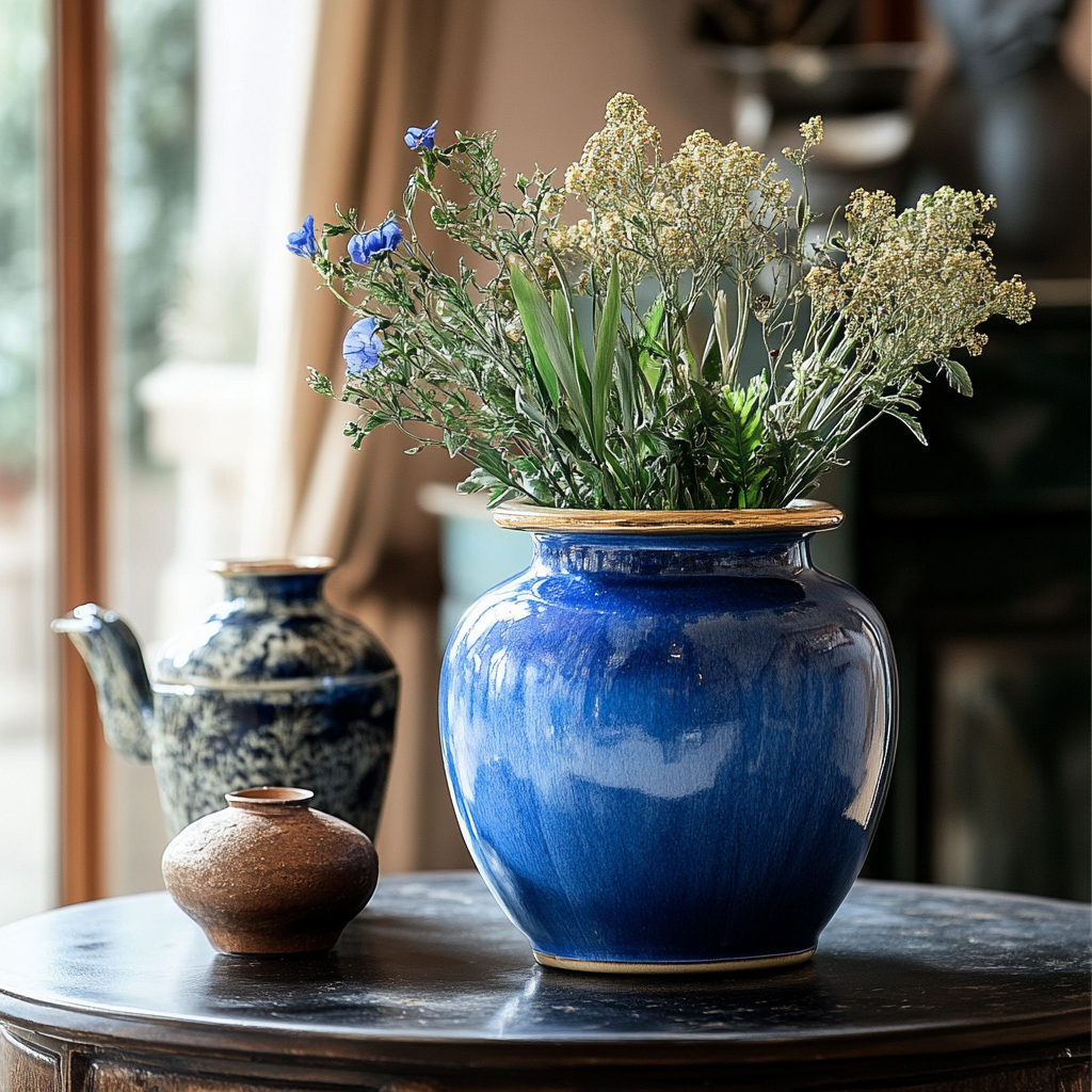 Composition de graminées, vase en céramique.