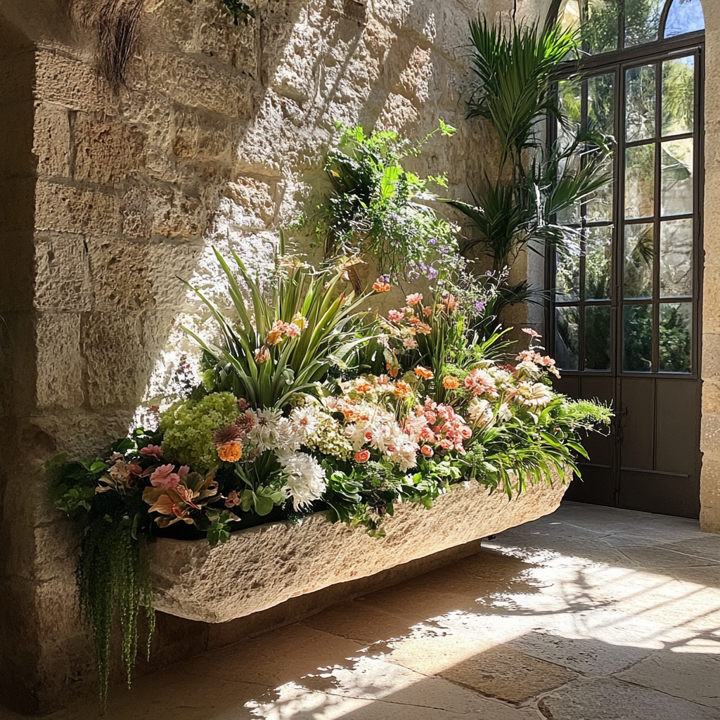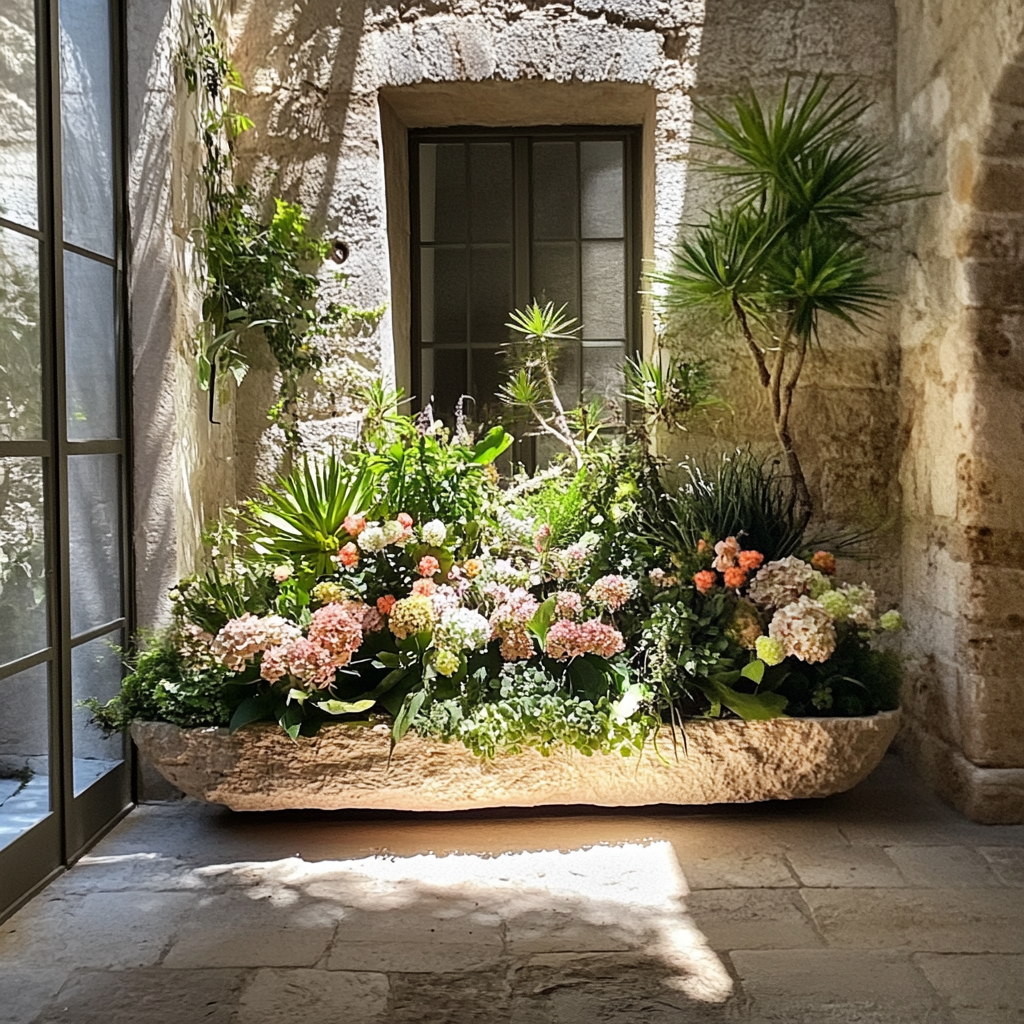 Paysage domestiqué végétal et floral, abreuvoir en pierre.